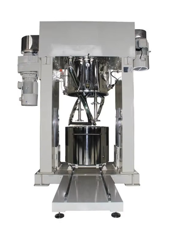 Двойной планетарный смеситель состоит из низкоскоростного агитатора и высокоскоростного диспергера, имеет хороший эффект смешивания, реакции, диспергирования, растворения,специально предназначенный для диспергирования и смешивания твердо-жидких материалов, жидкости-жидкости фазы; Он вполне подходит для высокой вязкости продукта, таких как клеи, силикон, литий батареи сгусток и т.д. из-за его сверх сильный выходной момент;Оборудование имеет скребпер который может скребнуть дно резервуара без мертвого угла или остатковТакже есть экструзионное устройство и скользящая рельса, чтобы работать вместе с этой машиной, чтобы реализовать интегрированную операцию смешивания и разгрузки.